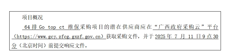 簡要規(guī)格描述或項目基本概況介紹、用途:64排Go top ct 維保1項。如需進(jìn)一步了解詳細(xì)內(nèi)容,詳見競爭性磋商文件。