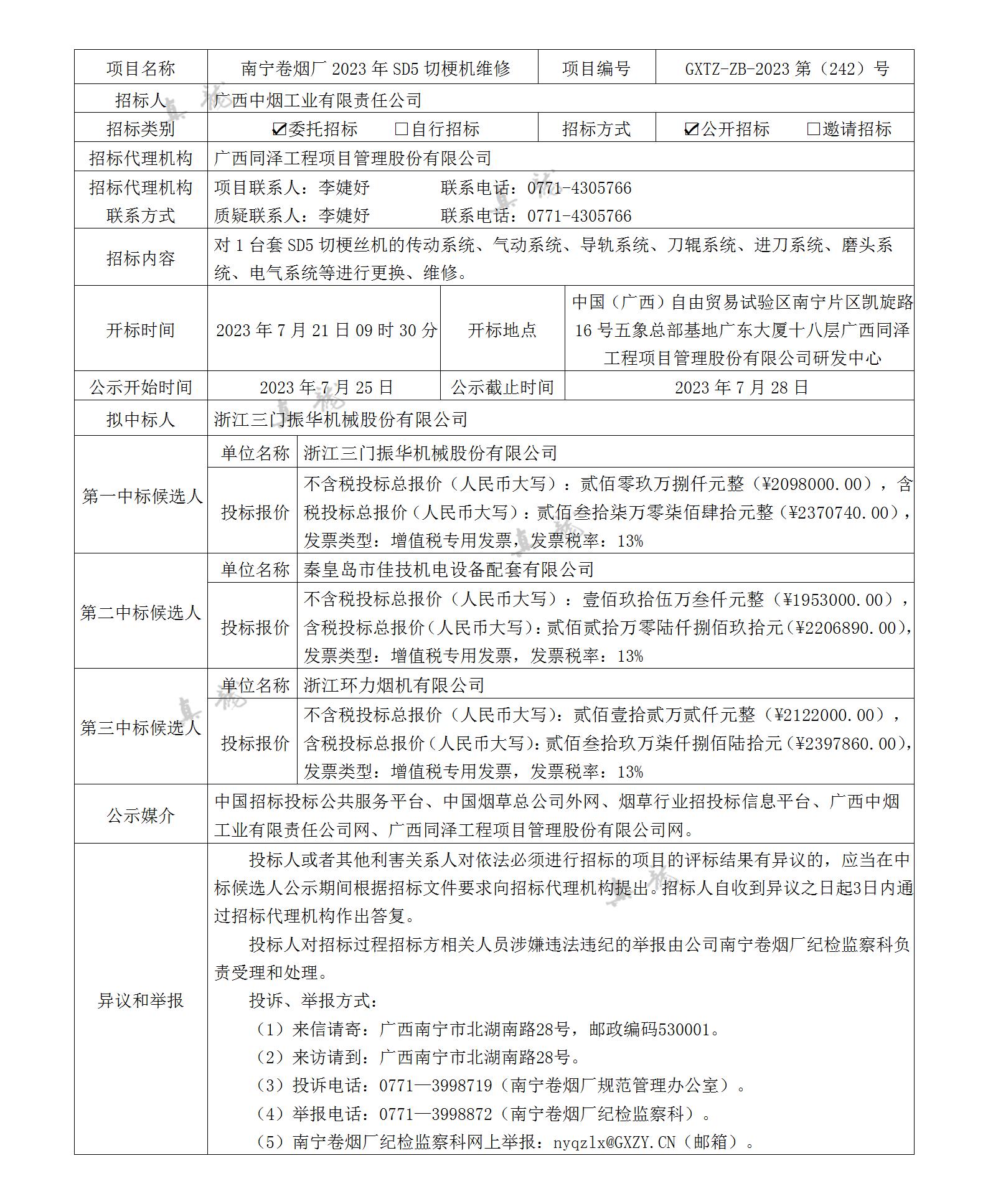 廣西中煙工業(yè)有限責(zé)任公司南寧卷煙廠2023年SD5切梗機(jī)維修(項(xiàng)目編號(hào):GXTZ-ZB-2023第(242)號(hào))中標(biāo)候選人公示
