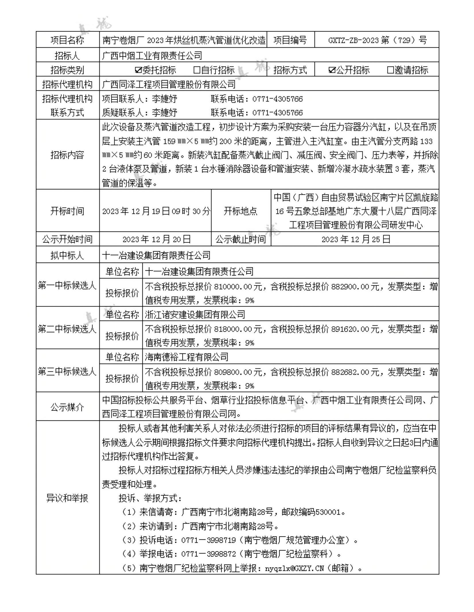 廣西中煙工業(yè)有限責(zé)任公司南寧卷煙廠2023年烘絲機(jī)蒸汽管道優(yōu)化改造(項(xiàng)目編號(hào):GXTZ-ZB-2023第(729)號(hào))中標(biāo)候選人公示