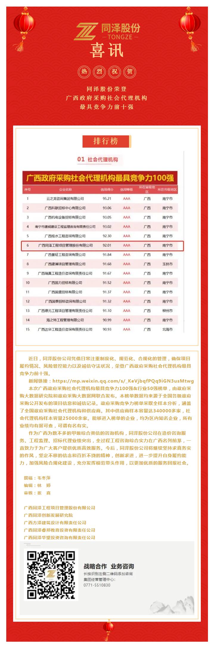 喜訊|同澤股份榮登廣西政府采購社會代理機(jī)構(gòu)最具競爭力前十強(qiáng)